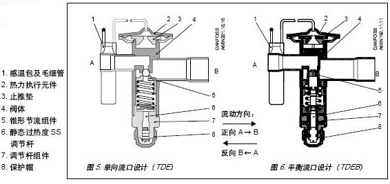 参考资料: 感温包温度:150℃ 阀体温度:120℃ 短时阀体温度:150℃ 工作压力:PB=28bar 试验压力:P'=32bar 泄流能力:15% (可按要求定做) 外平衡管接口:1/4in./6 mm管外钎焊 毛细管长度:TED 3-7.5 1.5m,TED 8-19 1.5m,TED 20-40 3.0m 双向流操作:具有双向平衡流口及用于大范围环境温度条件变化情况下的TDEB阀是为双向流操作而设计的。在反向流动情况下,制冷 能力在试验压力条件下减少15%。带MOP的TD热力膨胀阀不适用于双向流操作